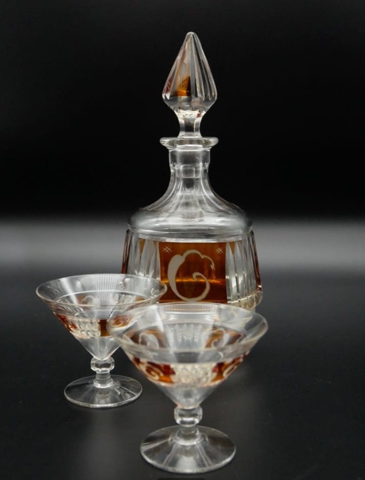 Antique Retro Johansfors glass carafe with two liqueur glasses 1930s
